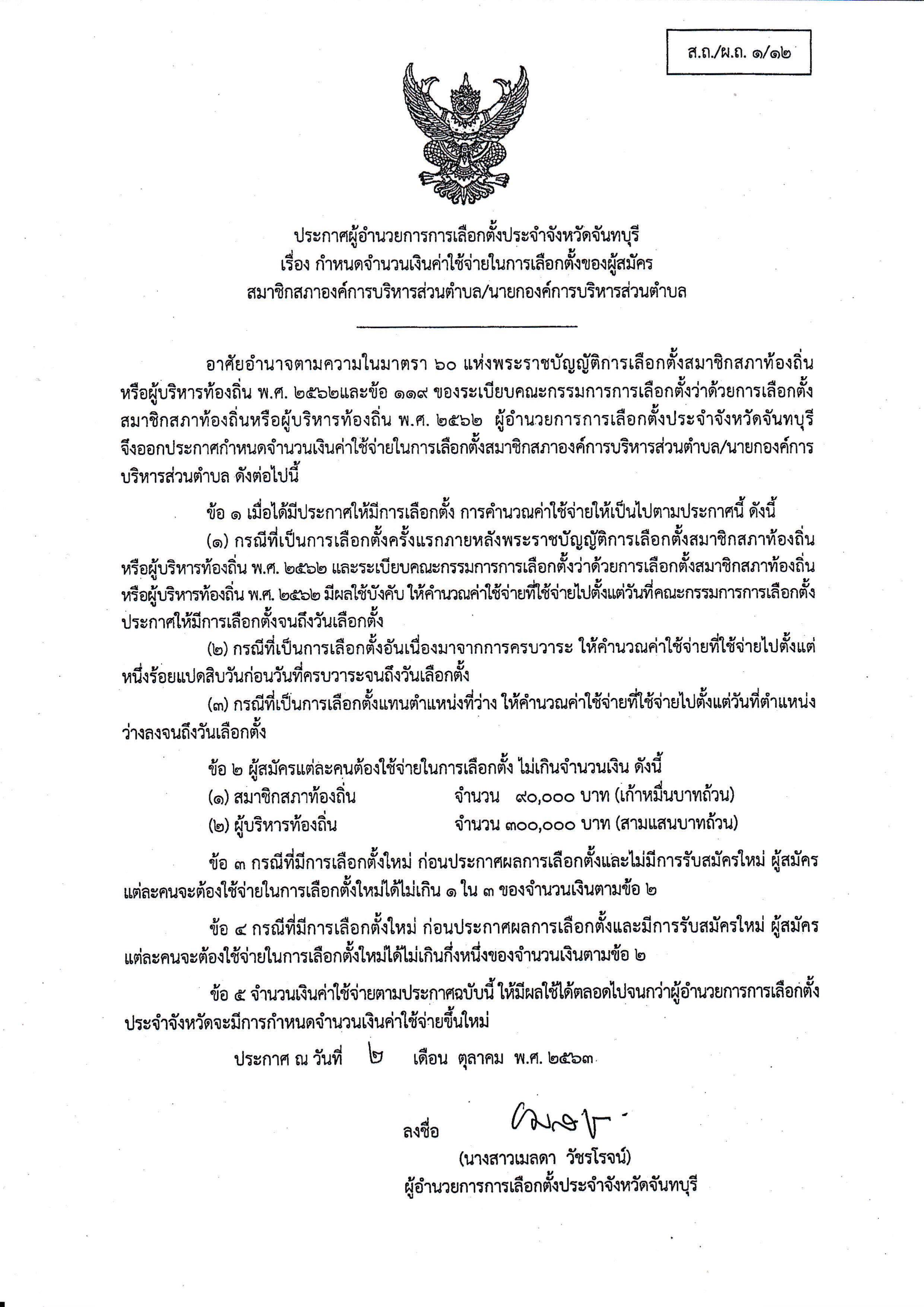 ประกาศเรื่อง กำหนดจำนวนเงินค่าใช้จ่ายในการเลือกตั้งของผู้สมัคร